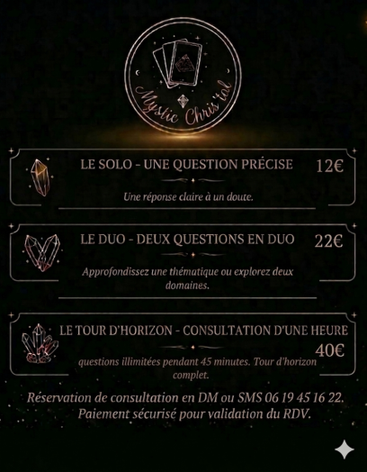 Chez Mystic Chris'tal, je pense que la guidance doit s'adapter à votre vie, et non l'inverse. C'est pourquoi je vous propose des consultations uniquement par messages (SMS, messenger, WhatsApp, DM, à votre convenance).
